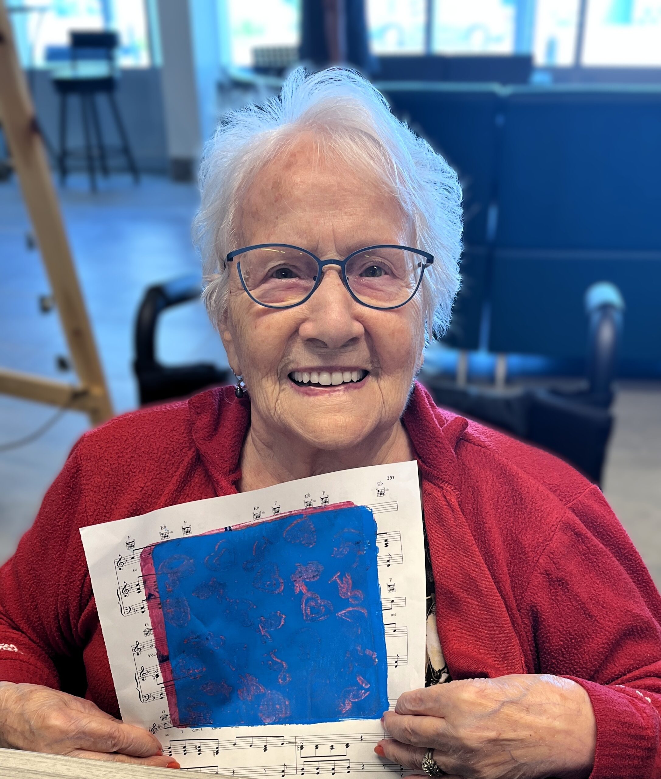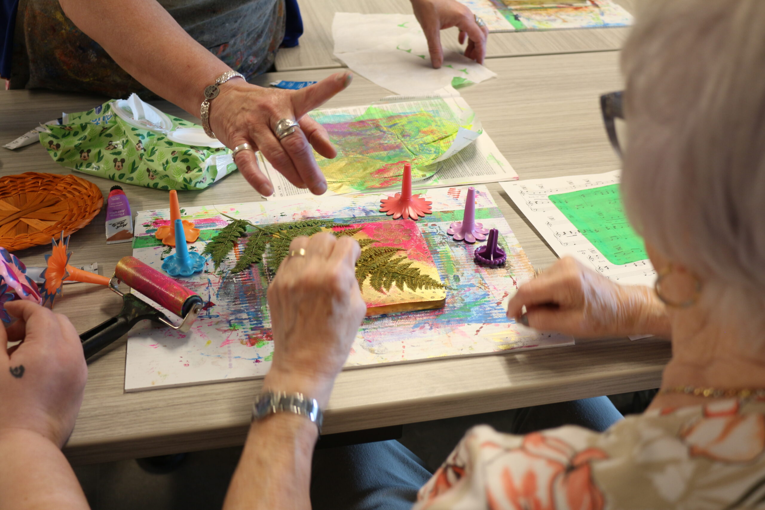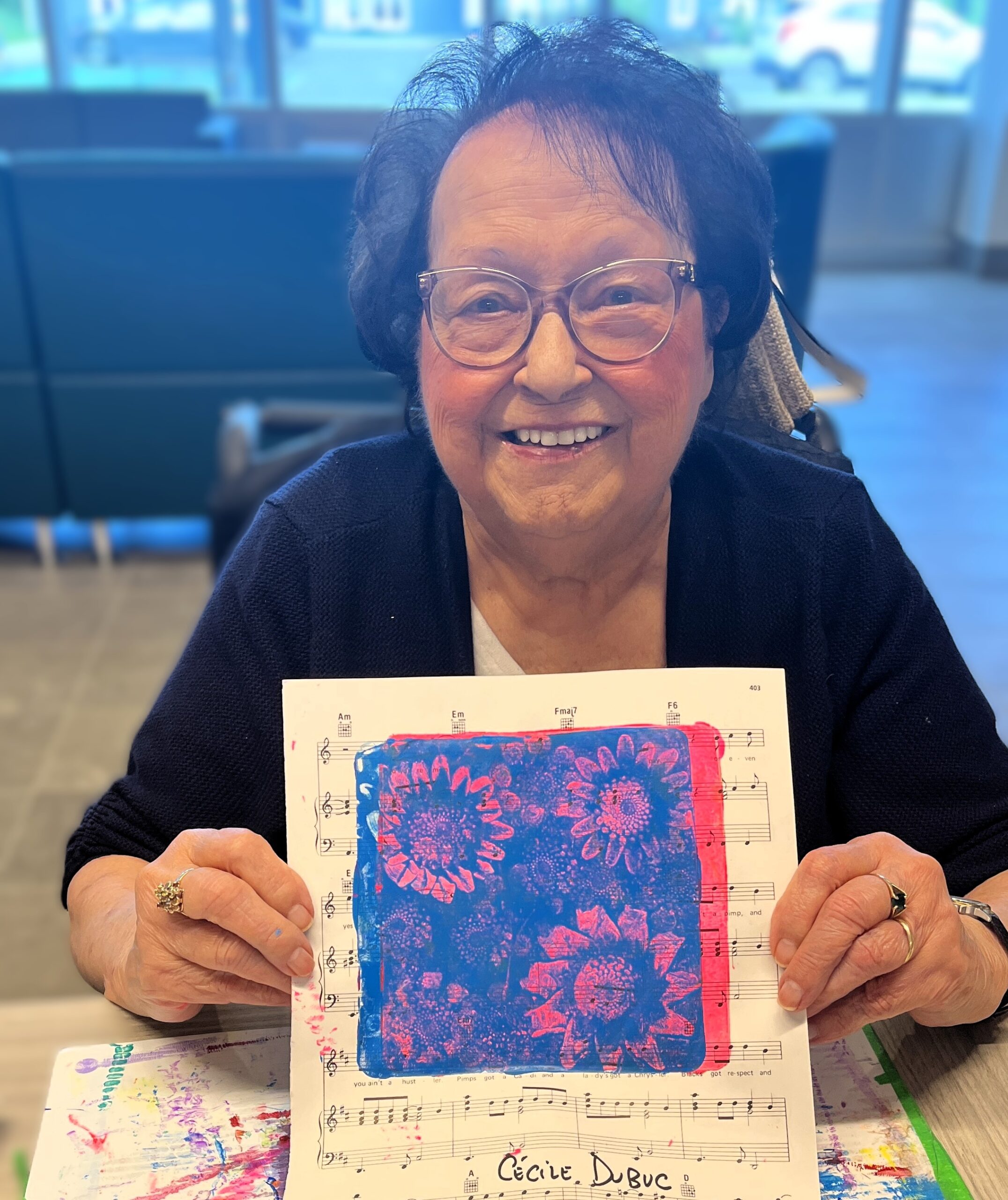 La première étape du projet consistait à créer la matière première : soit les impressions gelpress. 2 journées par milieu de vie y ont été consacrées. L’investissement du personnel et des bénévoles de chaque milieu a grandement contribué au succès de ces journées. En tout, 212 résidents-créateurs ont participé et un total de 402 impressions, incluant celles du personnel et des bénévoles, ont été réalisées. Toujours adepte de la réutilisation, les impressions ont été réalisées sur des feuilles de papier musique récupérées. Pour certains résidents, c’est la musique qui les a fait sortir de leur monde, pour d’autres, les paroles sur les partitions faisaient leur effet. Mais pour la majorité, les couleurs suffisaient. Le geste de rouler la peinture avec un rouleau rappelait aussi des souvenirs à certains.