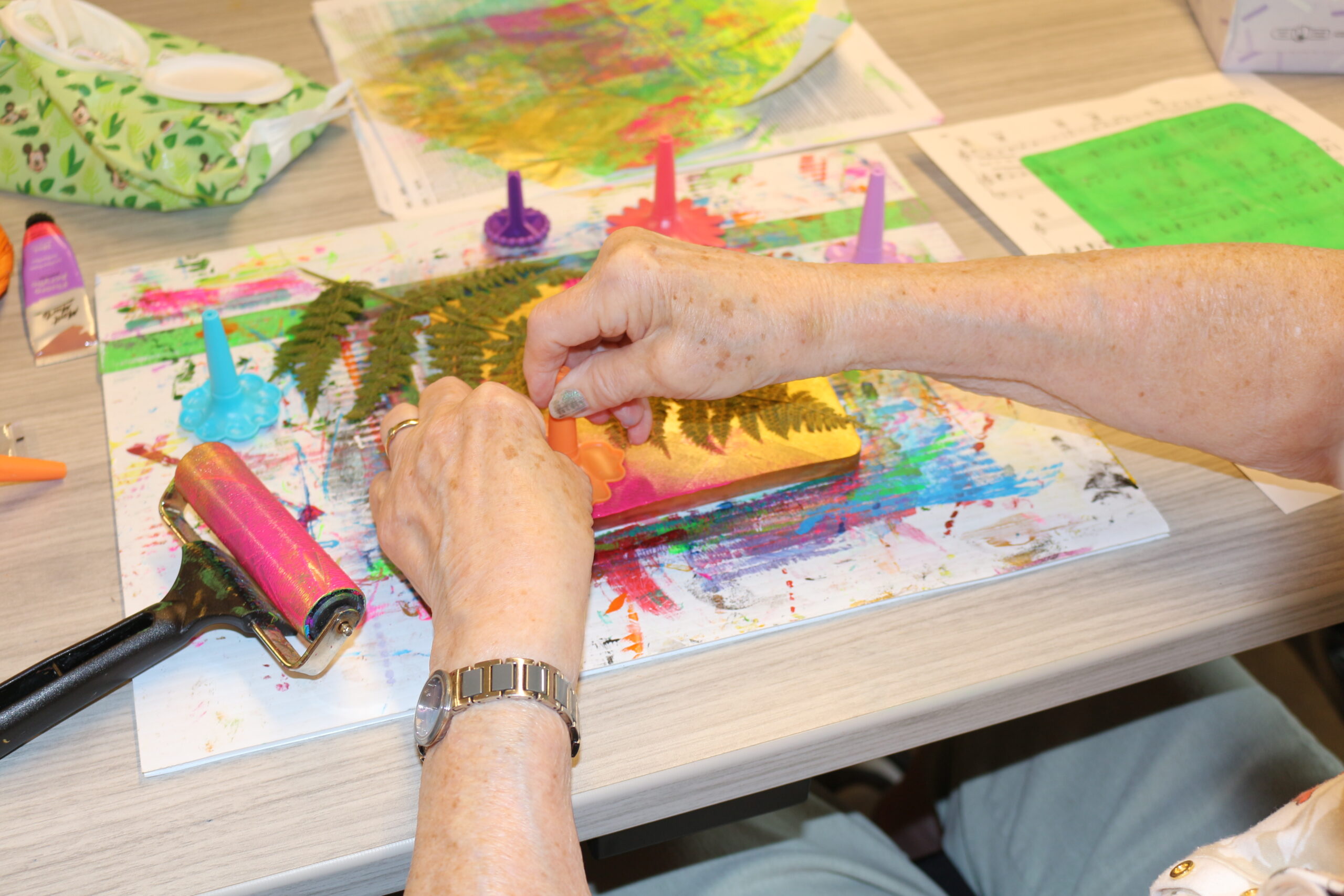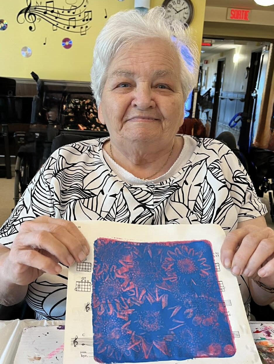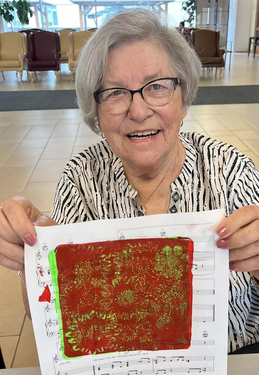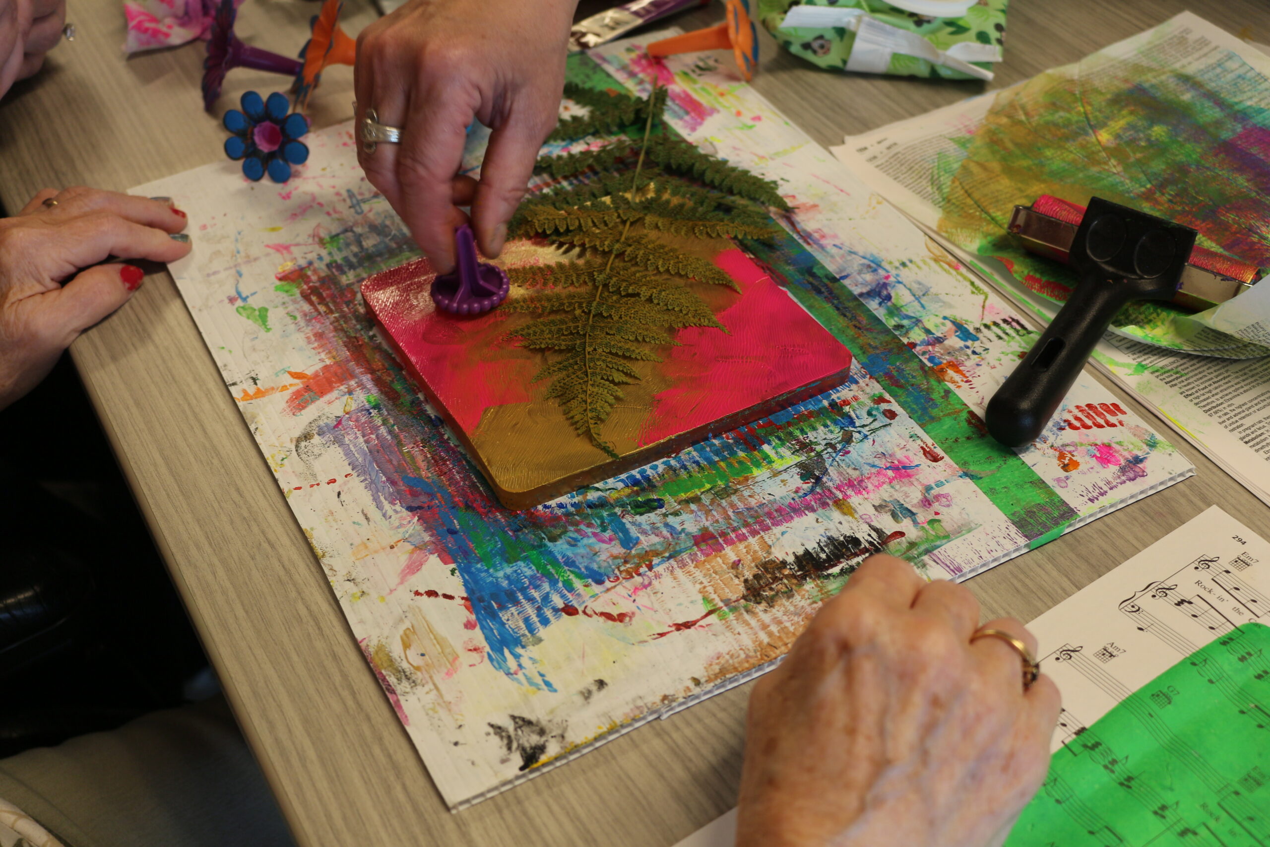 La première étape du projet consistait à créer la matière première : soit les impressions gelpress. 2 journées par milieu de vie y ont été consacrées. L’investissement du personnel et des bénévoles de chaque milieu a grandement contribué au succès de ces journées. En tout, 212 résidents-créateurs ont participé et un total de 402 impressions, incluant celles du personnel et des bénévoles, ont été réalisées. Toujours adepte de la réutilisation, les impressions ont été réalisées sur des feuilles de papier musique récupérées. Pour certains résidents, c’est la musique qui les a fait sortir de leur monde, pour d’autres, les paroles sur les partitions faisaient leur effet. Mais pour la majorité, les couleurs suffisaient. Le geste de rouler la peinture avec un rouleau rappelait aussi des souvenirs à certains.